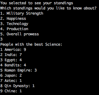 See Standings. When this option is selected, the user has the ability to see how they compare to other civilizations in the game. Your job is to implement the functionality of listing out the different types of standings.You will specifically need to edit the standings method in Model.java in the model package. Some of it is stubbed out for you. You just need to add the code that provides the appropriate functionality described above.